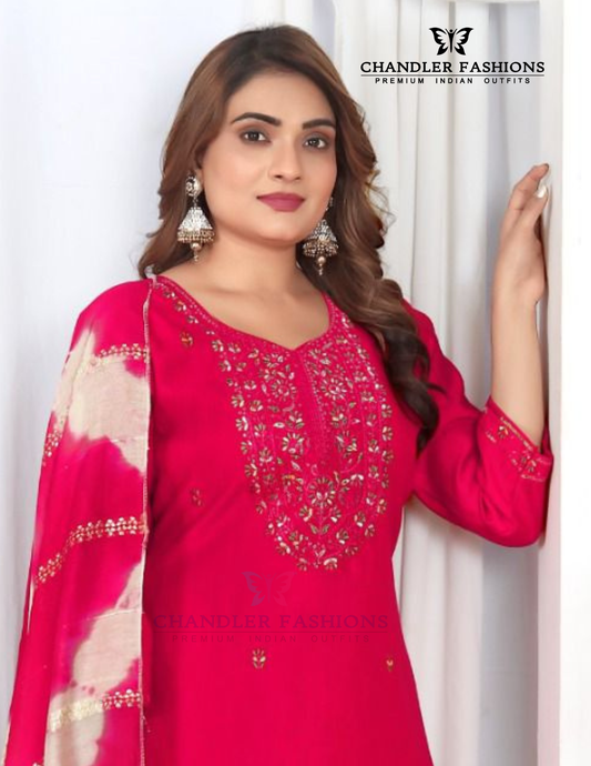 Attractive Dark Pink Color Silk Blend With Embroidery And Sequins Work Salwar Suits With Dupatta For Women