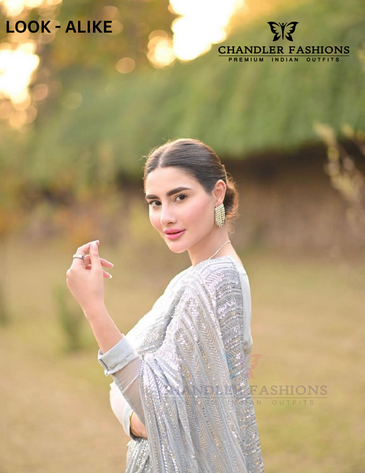 Japan Satin Plain Light Gray Fancy Saree With Sequins Satin Blouse