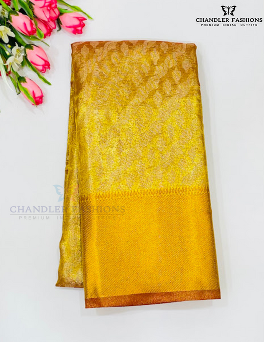 Attractive Mustard Yellow Color leaf motifs Pure Kanchi Silk Saree For Women