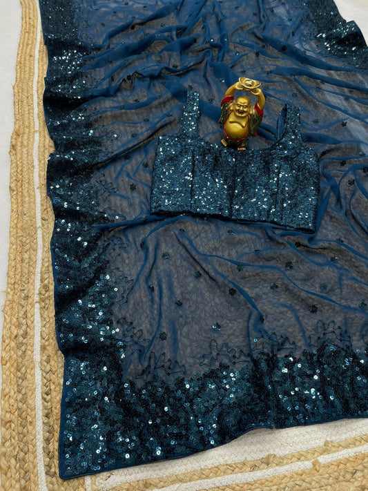Gorgeous Blue Color With Double Shade Georgette Sequins Saree For Women