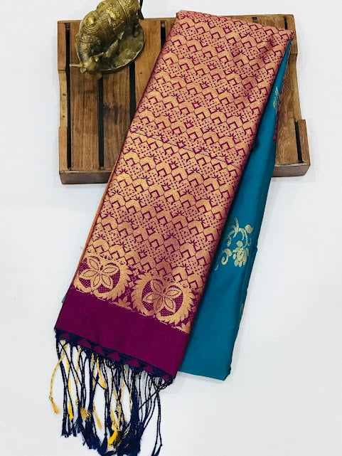 Elegant Teal Blue Colored Soft Silk With Contrast Border Royal Look Saree For Women