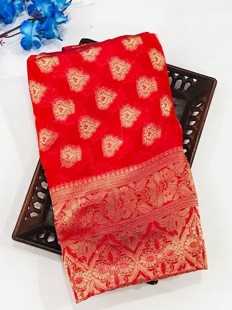 Pretty Red Color Designer Georgette Saree With Butta Motifs And Rich Pallu