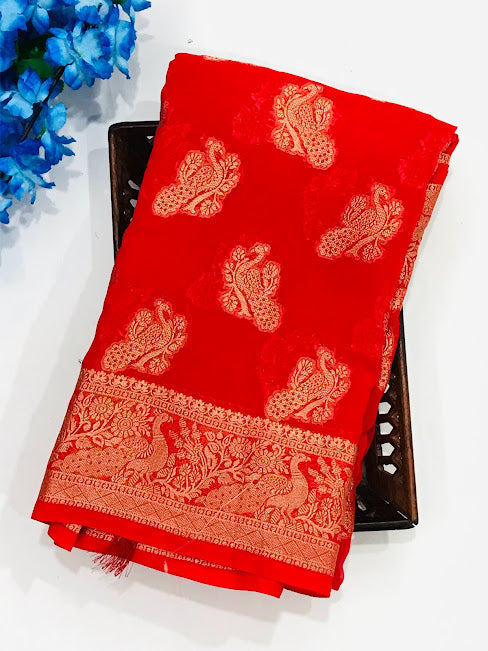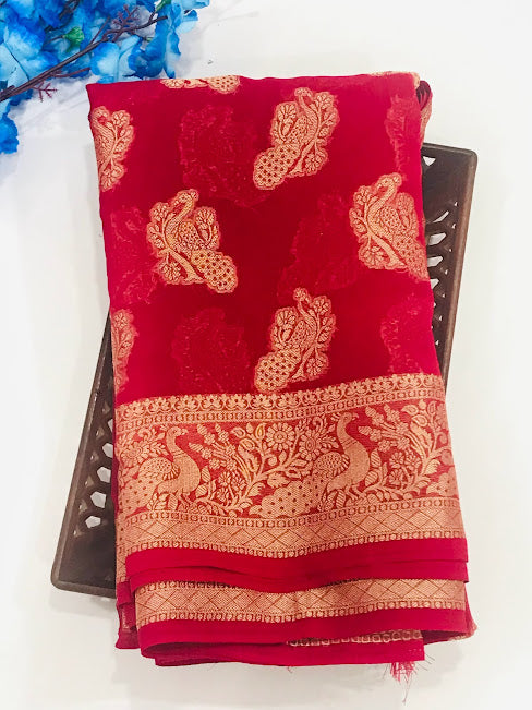 Fabulous Red Color Georgette Designer Saree With Peacock Motifs And Rich Pallu