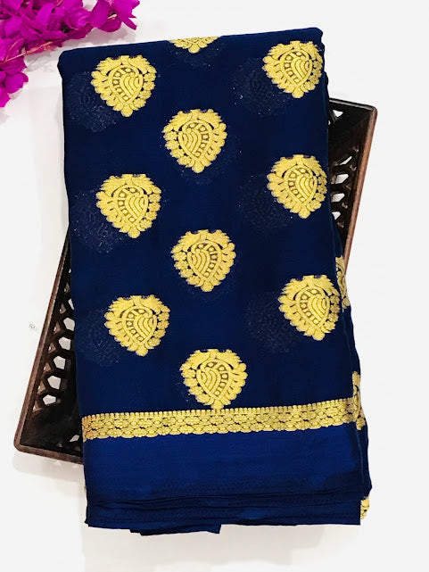Appealing Dark Blue Color Georgette Saree With Flower Motifs And Contrast Border
