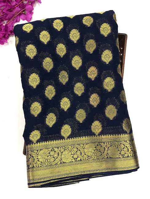 Elegant Dark Blue Color Designer Georgette Saree With Butta Motifs And Contrast Rich Pallu