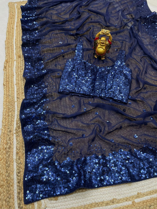 Dazzling Blue Colored Party Wear Sequins Work Soft Georgette Saree For Women