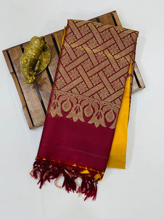 Attractive Yellow Colored Pure Kanchi Silk Saree For Women - SILKMARK CERTIFIED