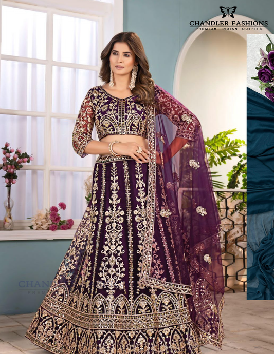 Pleasing Purple Color Butterfly Net With Embroidery And Sequins Work Lehenga For Women