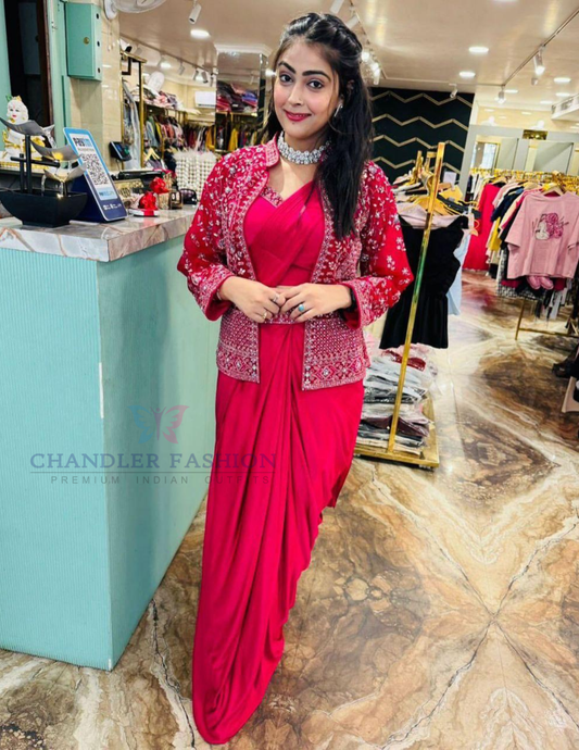 Stunning Dark Pink Color Embroidery And Sequins Work Ready To Wear Saree For Women