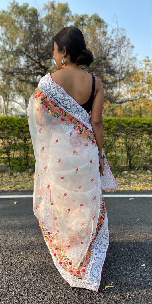 Appealing Soft Silk Thread Chikankari Work In Pallu Multiple Color Work Viscose Border Saree For Women