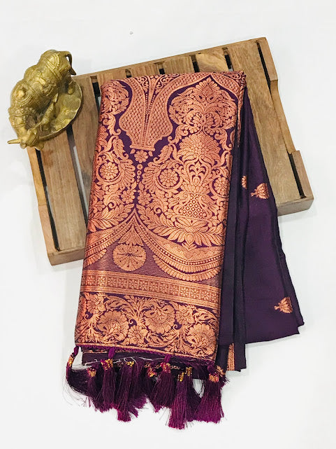 Attractive Dark Purple Colored Soft Silk Zari Work Saree With Tassels For Women
