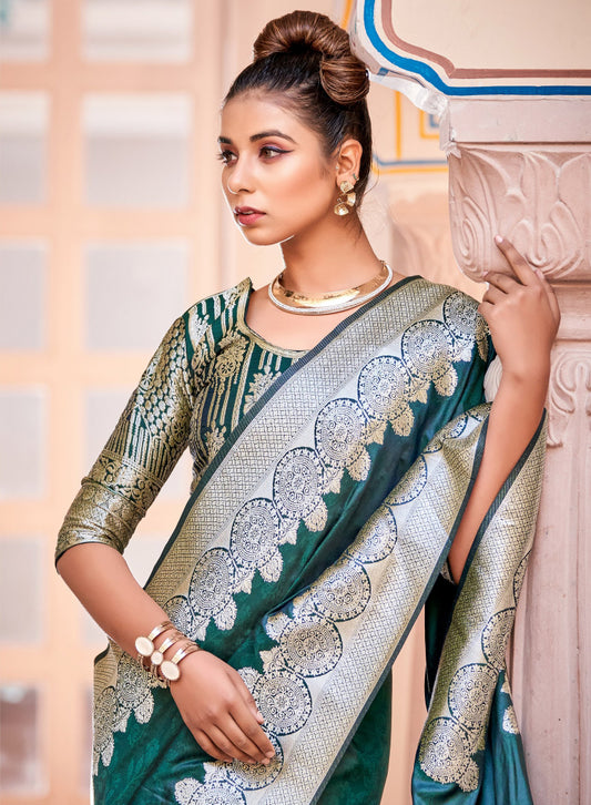 Appealing Dark Green Colored Banarasi Soft Silk Designer Printed Work Sarees