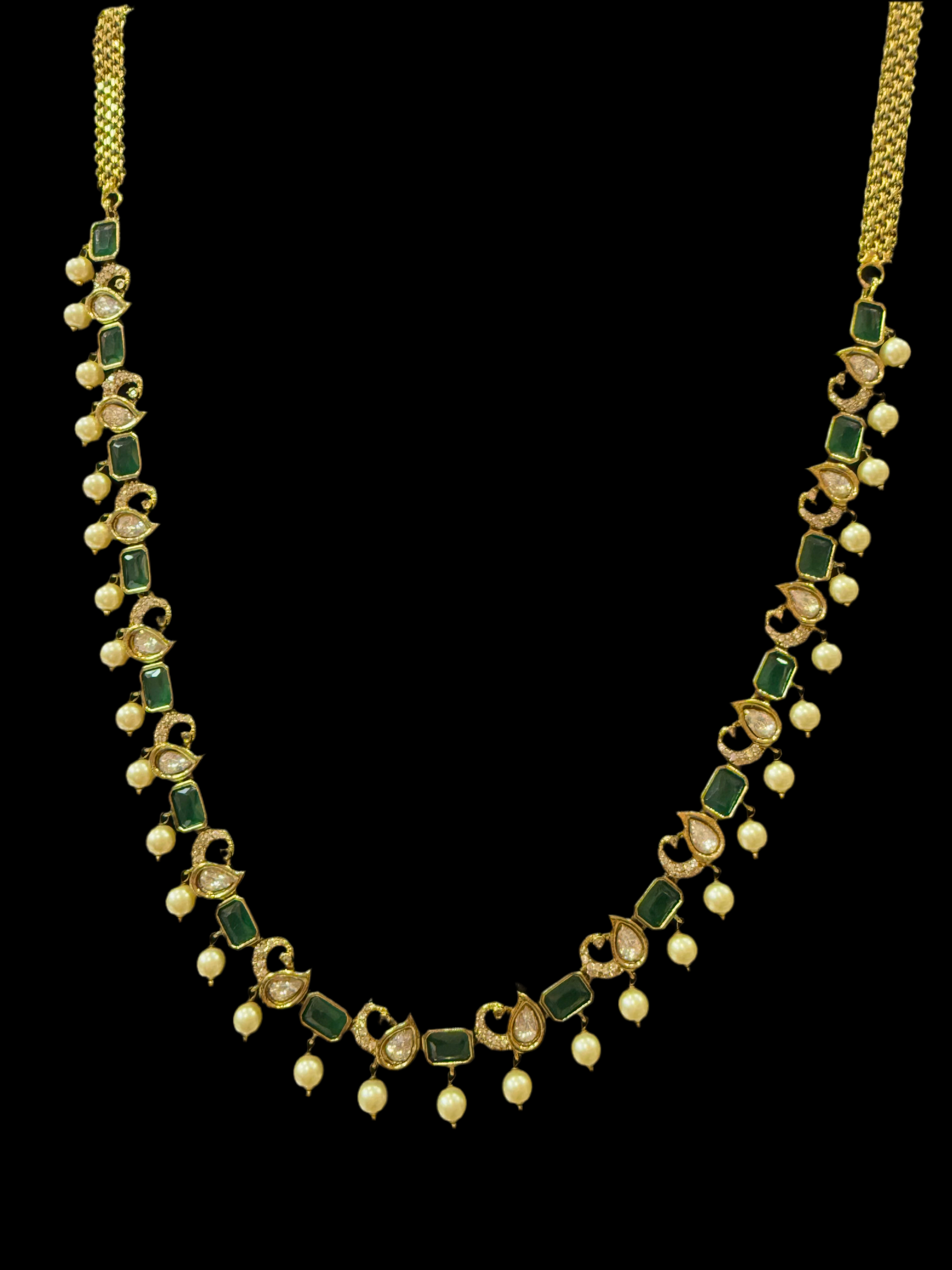 Alluring Gold Plated Green Stoned And White Beaded Long Chain