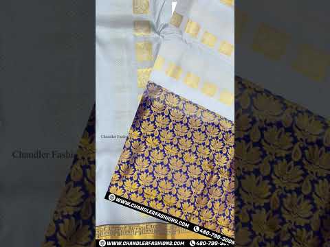 This luxurious "TRADITIONAL KANCHI PATTU" The Image Shows A Gray Silk Saree With Intricate Gold Zari Work On The Border And Pallu. The Saree Features A Contrasting Blue Color Blouse Piece With Gold Detailing. It Appears To Be A Traditional Indian Saree, Likely A Kanchipuram Silk Saree, Known For Its Rich Colors And Intricate Weaving Patterns.