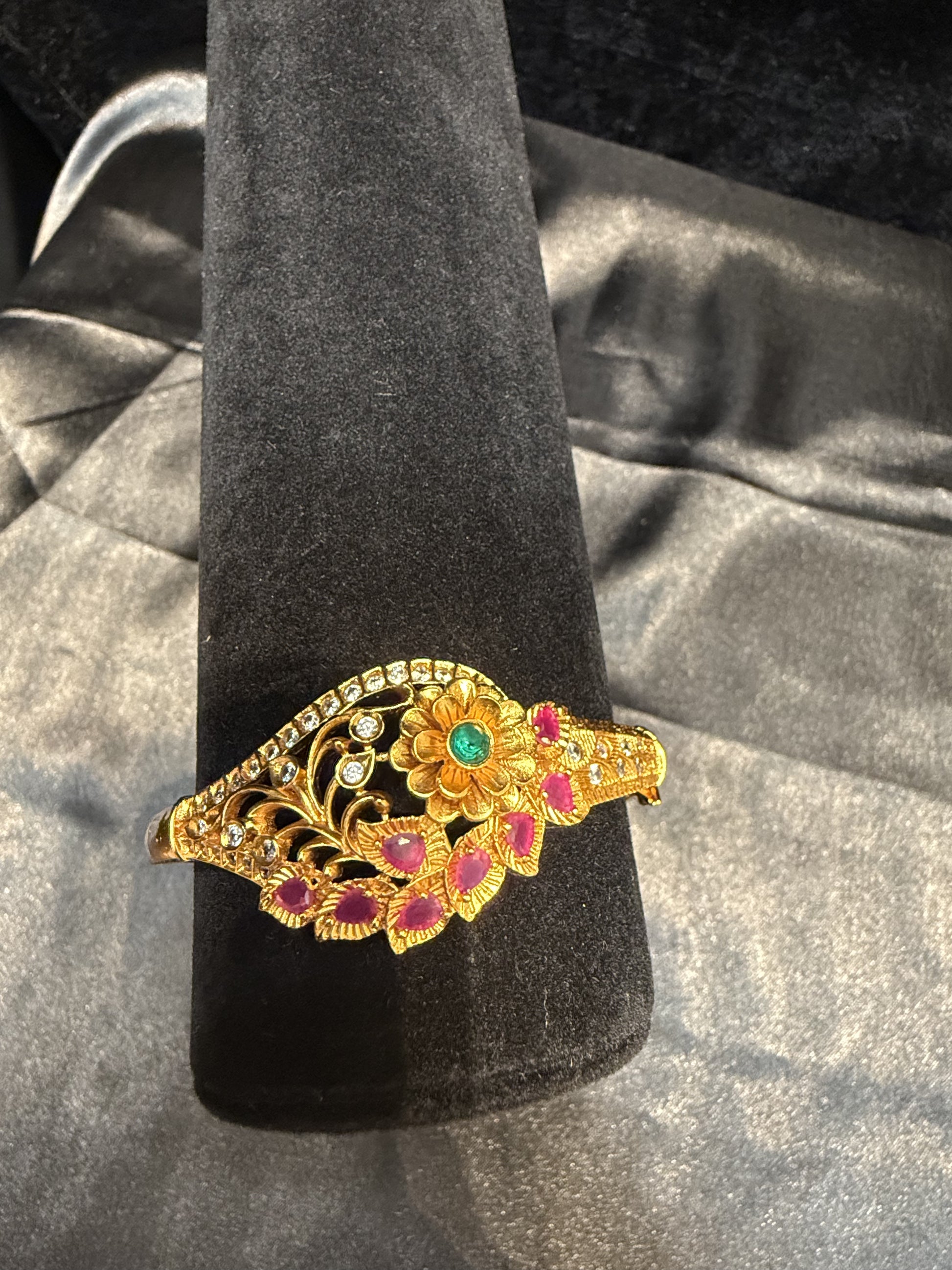 Beautiful Gold Plated With Pink And Green Stone Bracelet With Flower And Leaf Shape