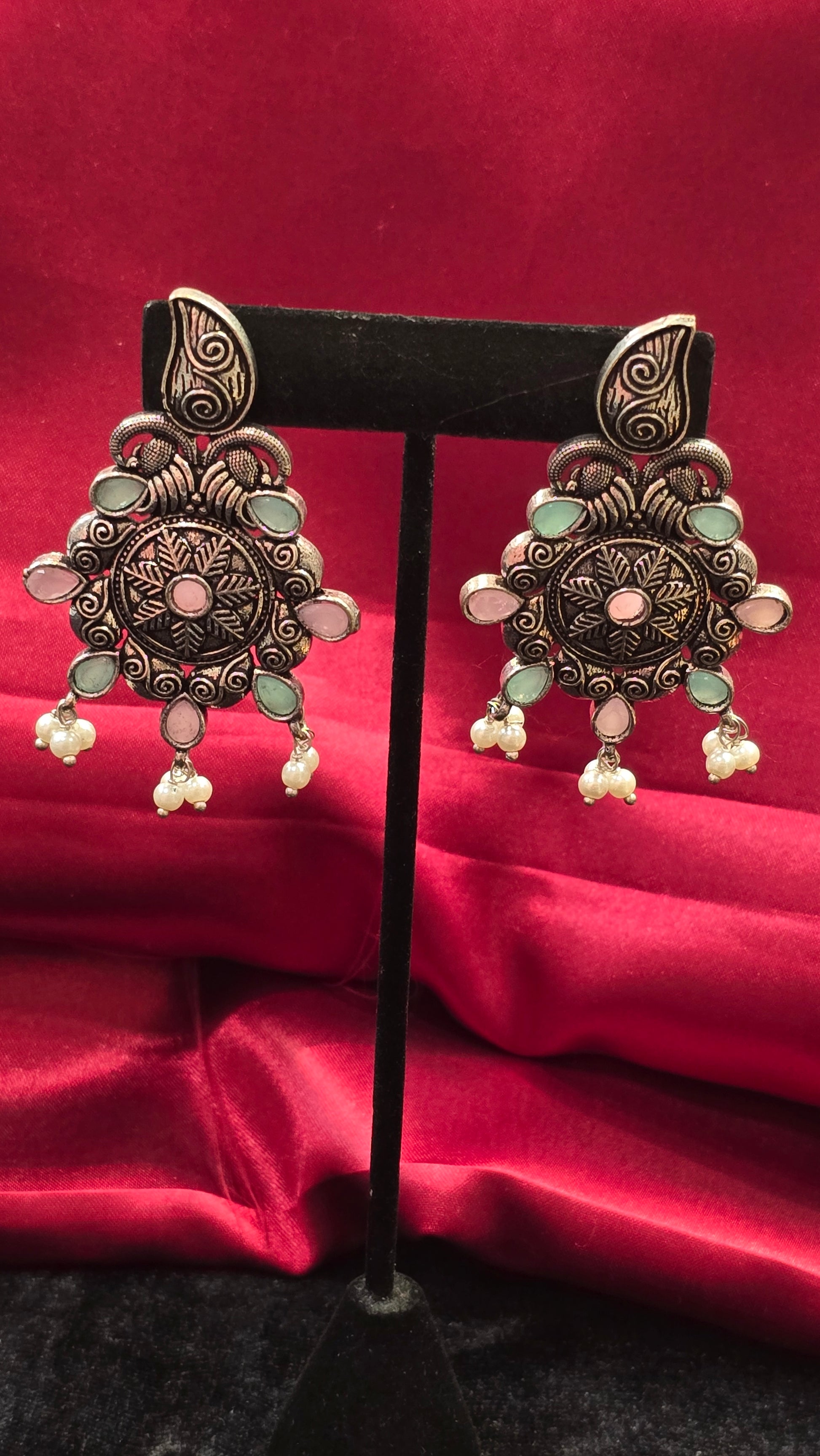 Dazzling Pink And Green Color Earrings With Leaf Pattern