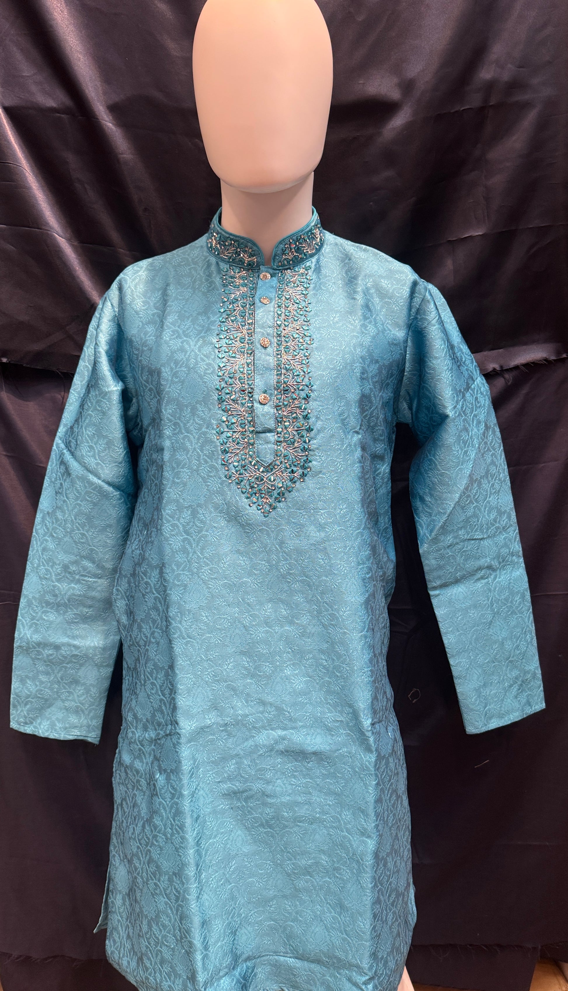 Delightful Teal Blue Color Cotton With Embroidery Work Designer Men's Kurta With Pajama Pant