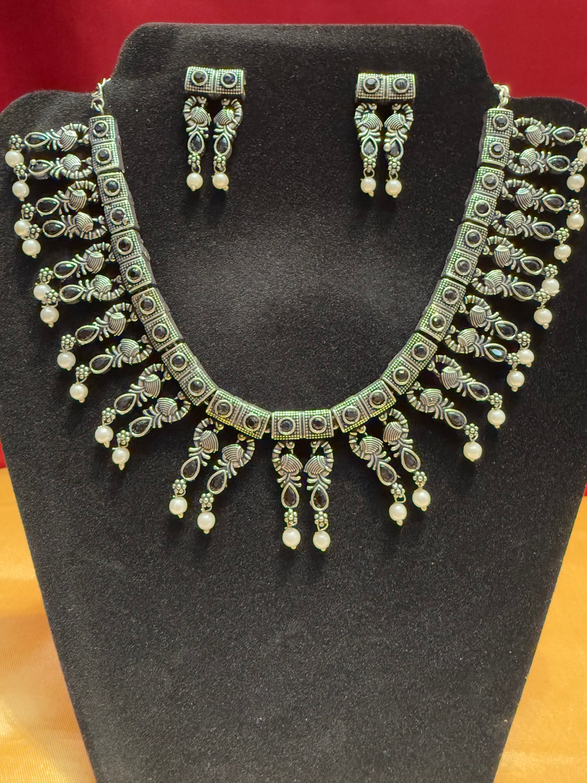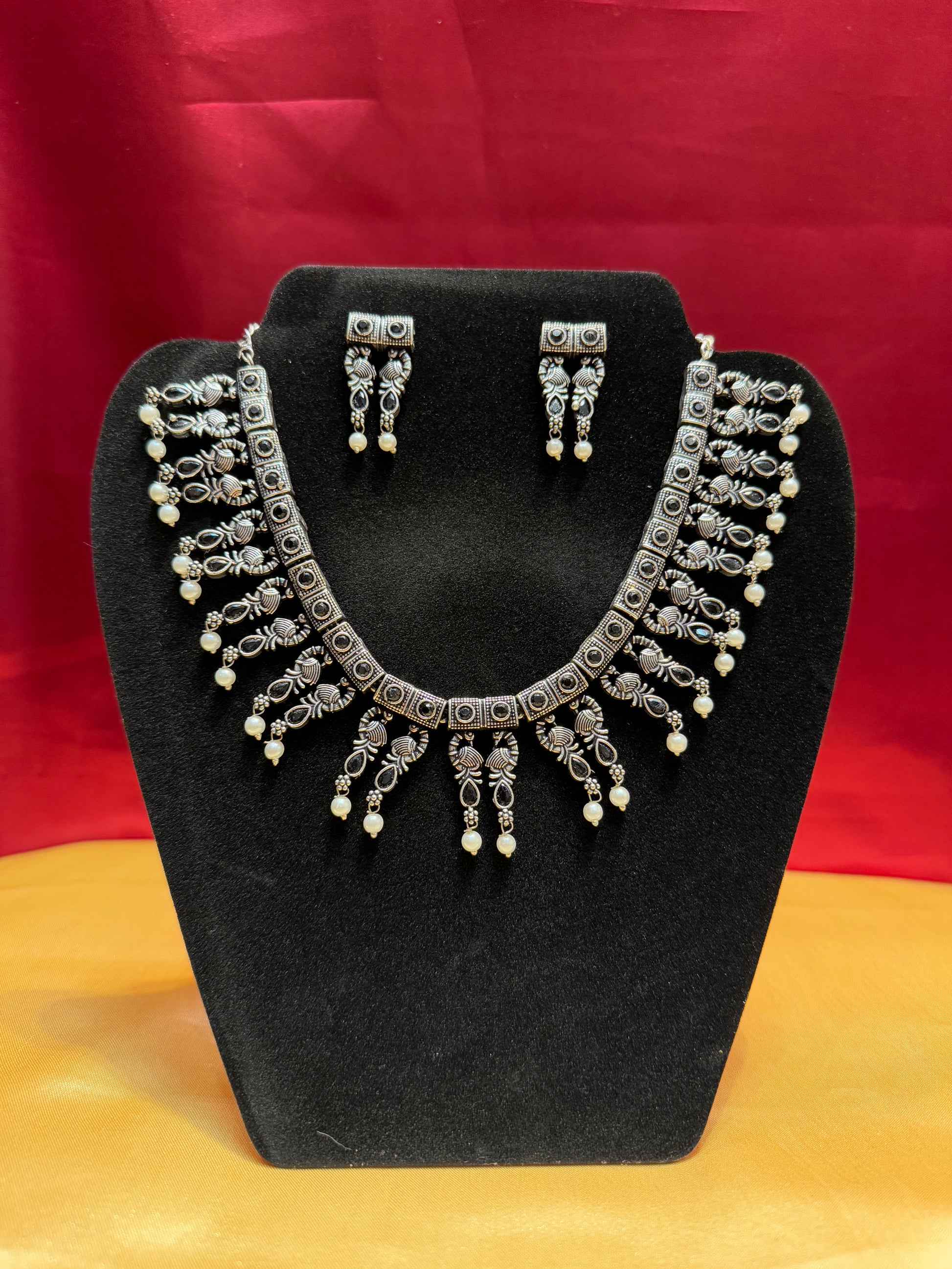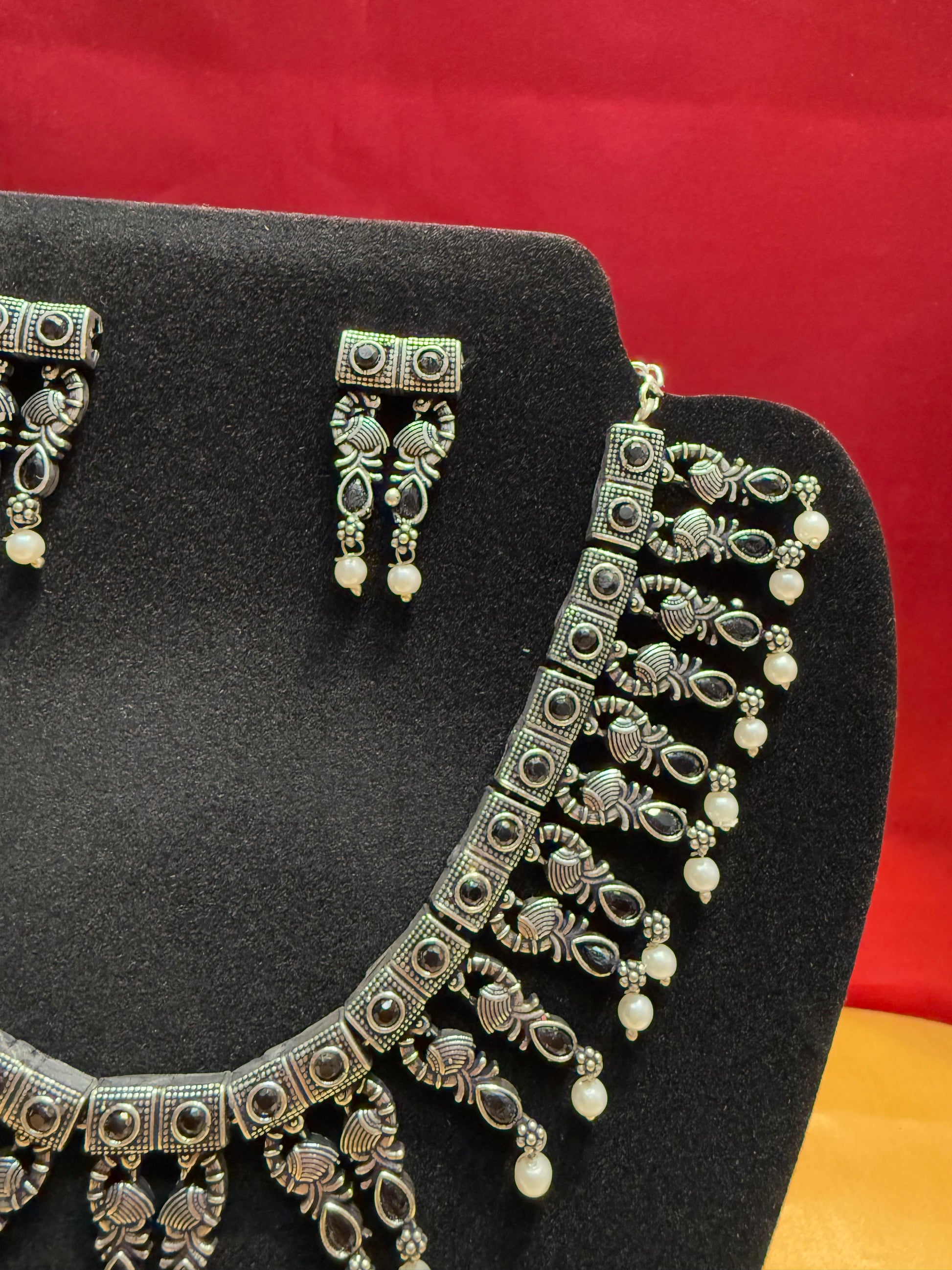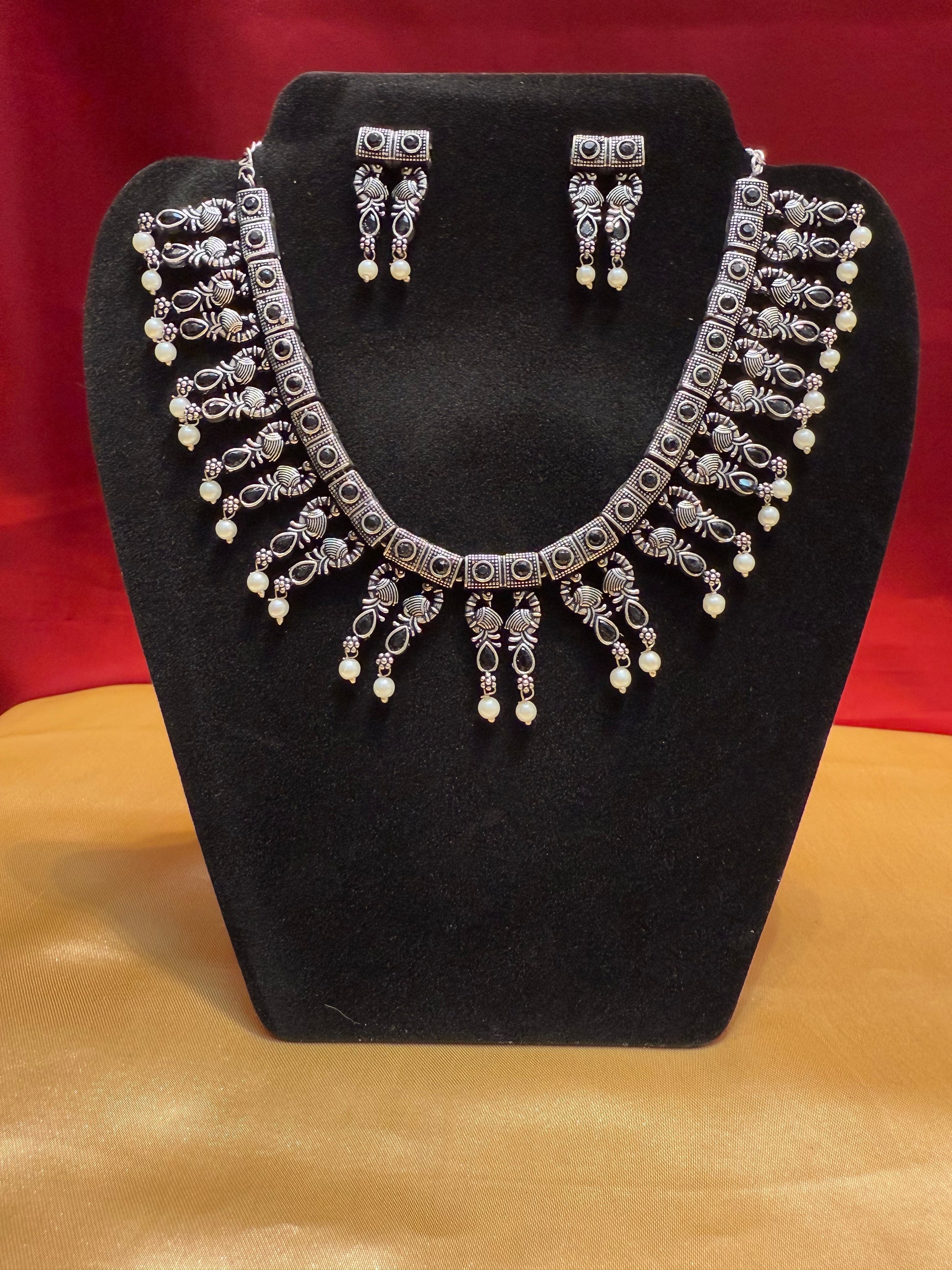 Elegant Black Color Oxidized Pearl Drop Necklace With Earrings Set