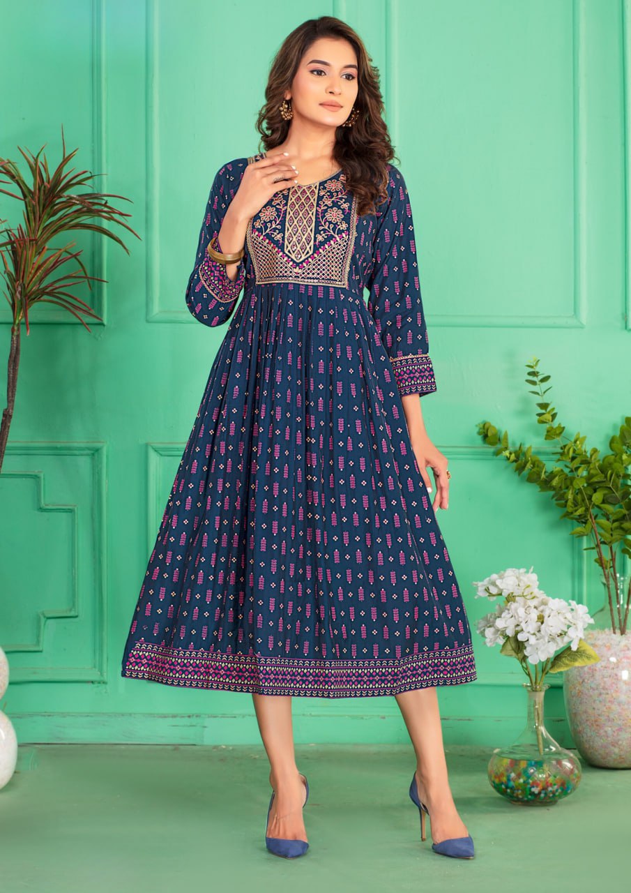 Elegant Blue color Screen Print Flared Long Kurti With Computer Embroidery Yock With Lace Kurti For Women