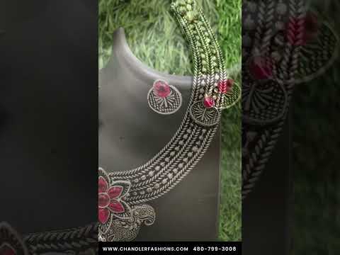 Fanciable Pinky Stone Oxidized Designer Necklace With Earrings Sets