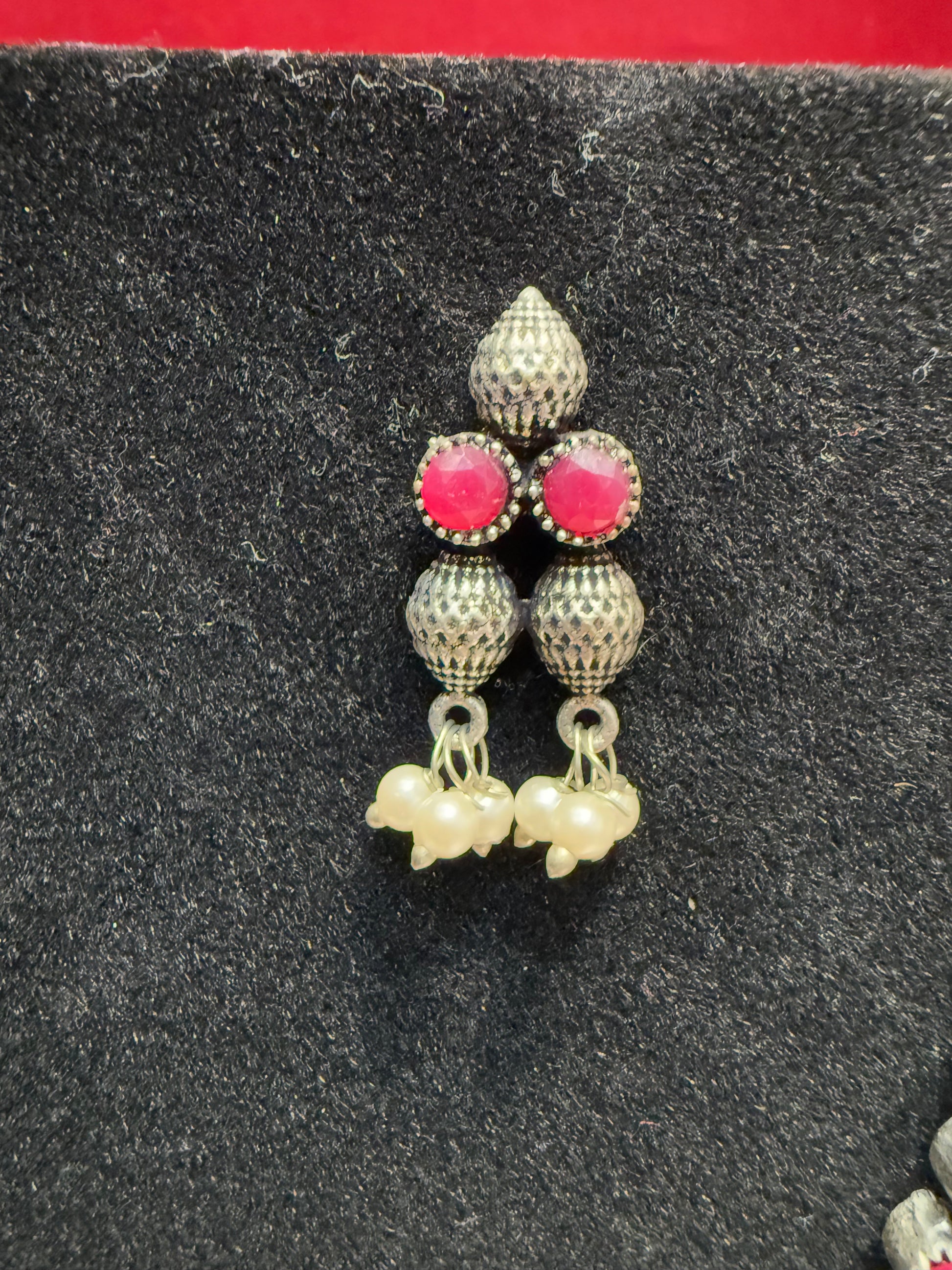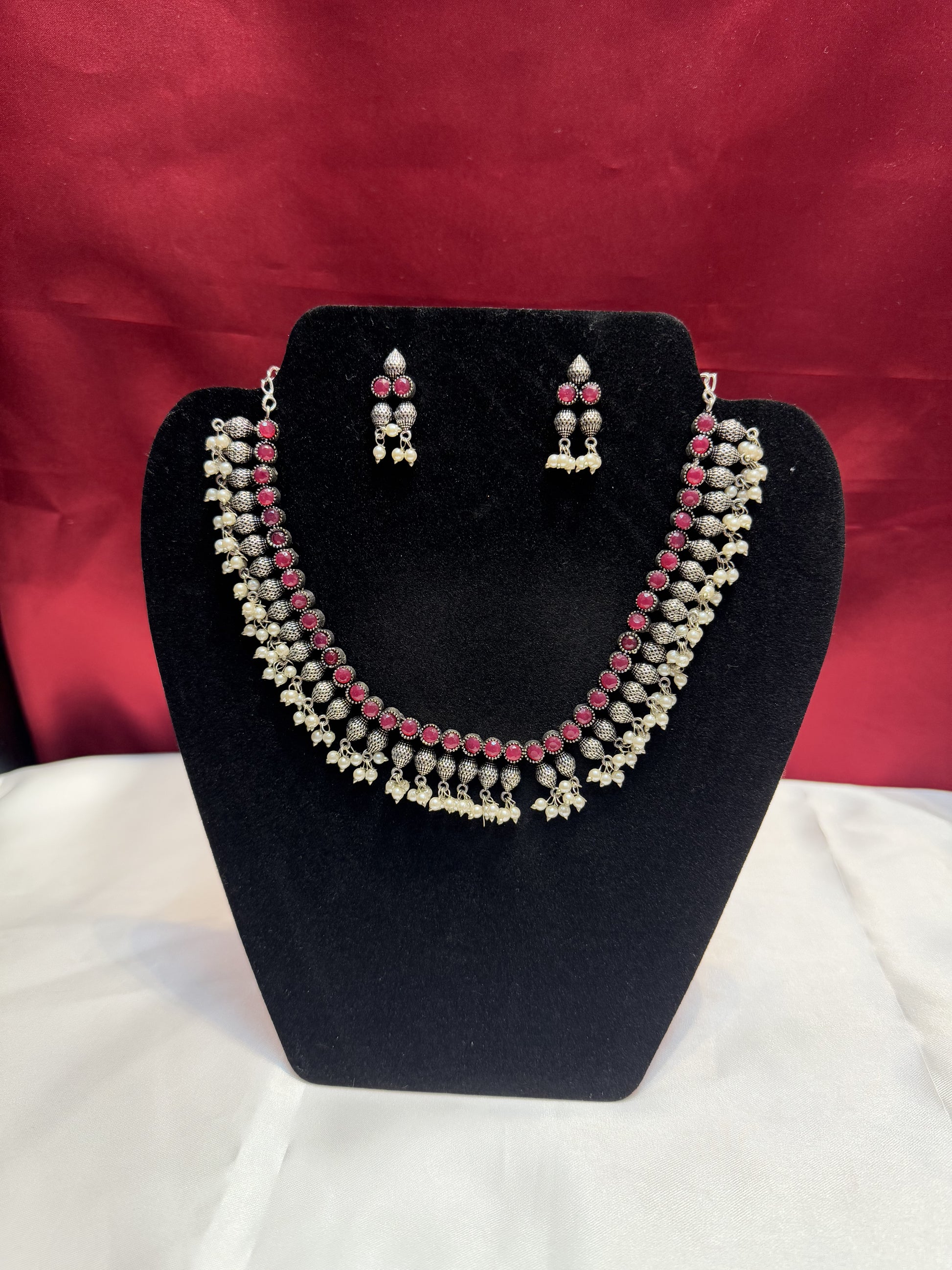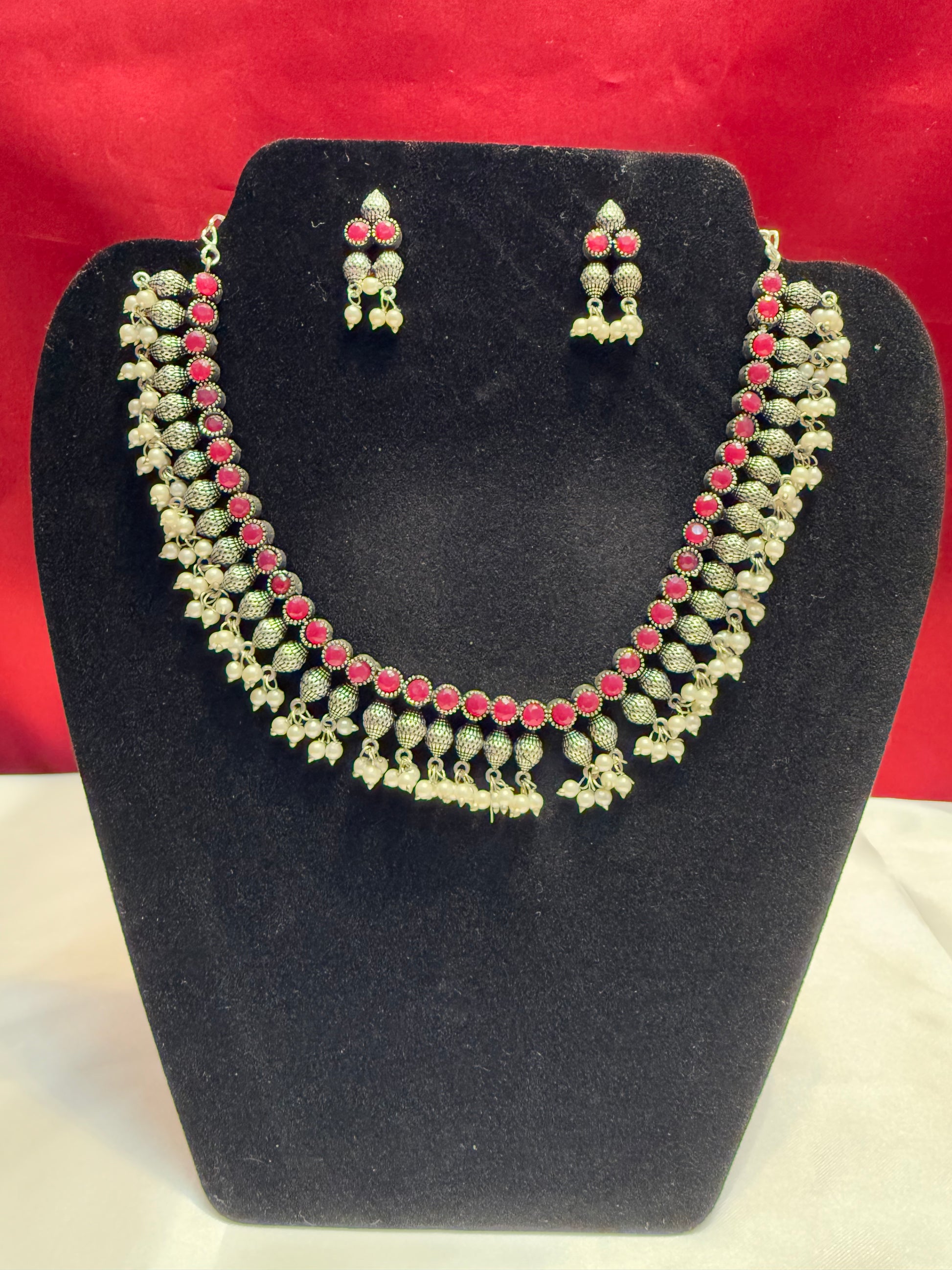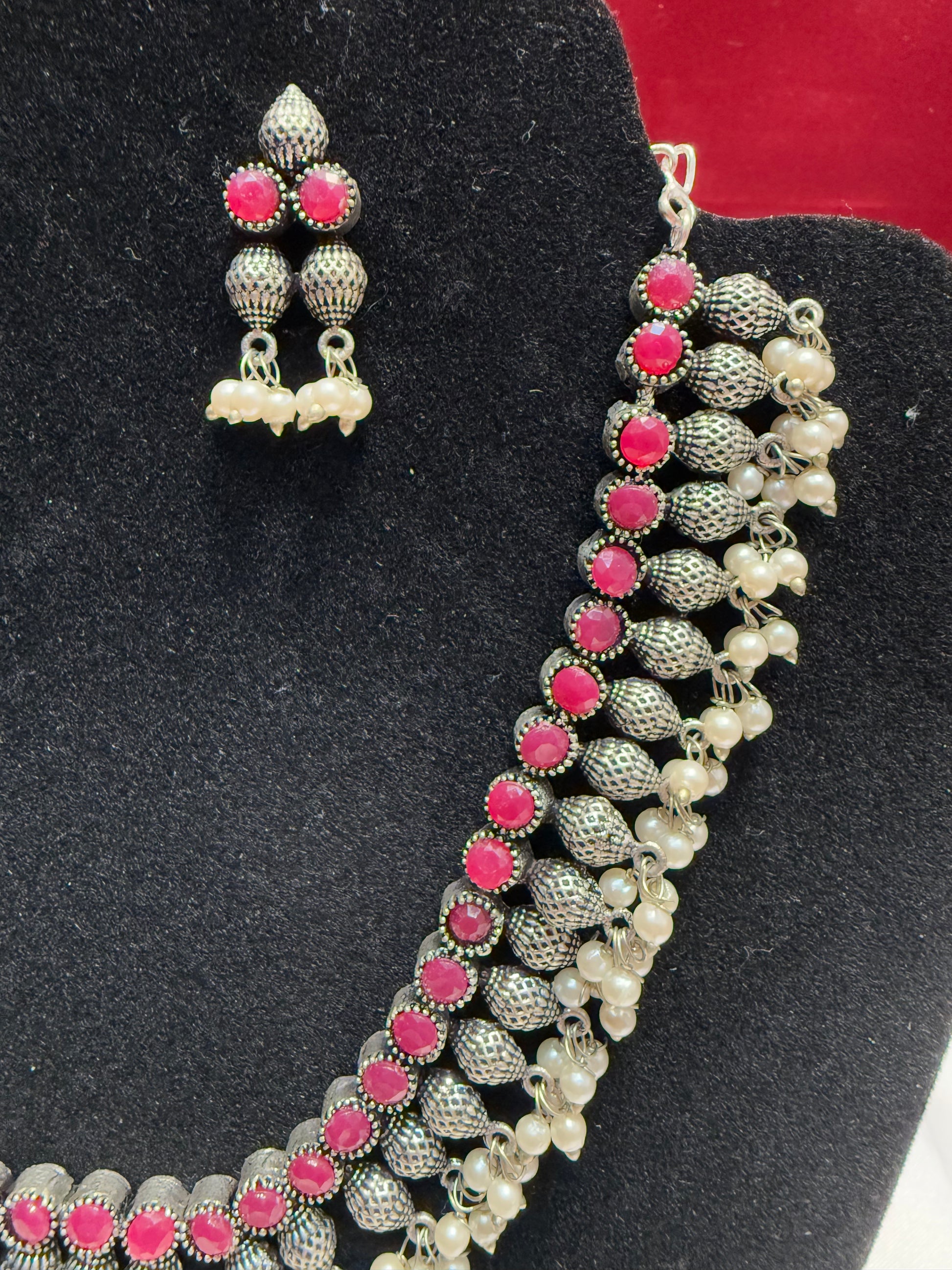 Fascinating Magenta Color Perls Drop Designer Oxidized Necklace Set