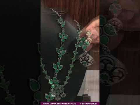 Appealing Emerald Stone Beaded German Silver Plated Designer Oxidized Necklace Set With Matching Earrings