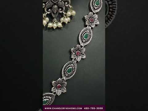 Dazzling Multicolor Stone Studded Peacock Floral Designed Silver Toned Oxidized Necklace With Earrings