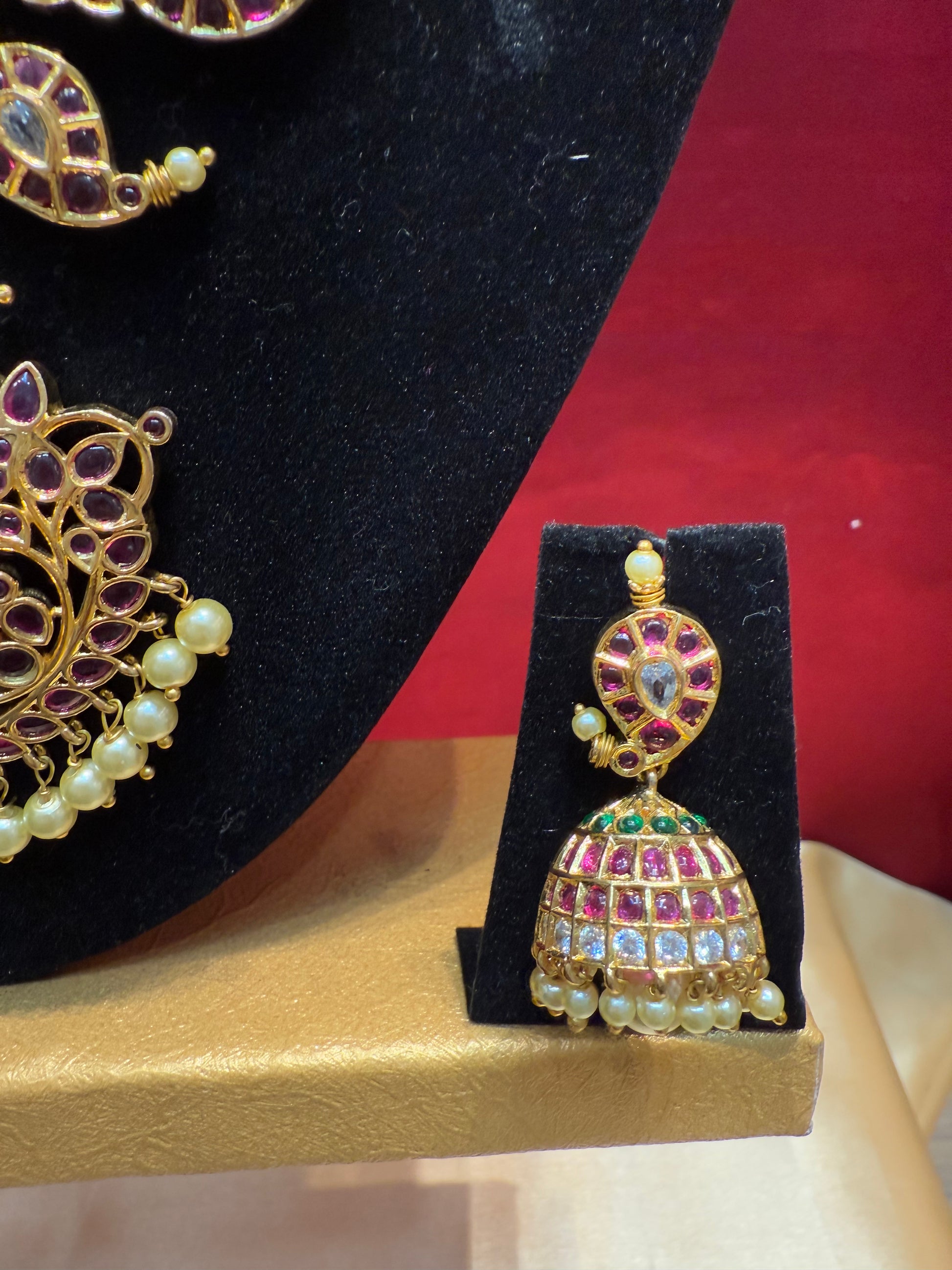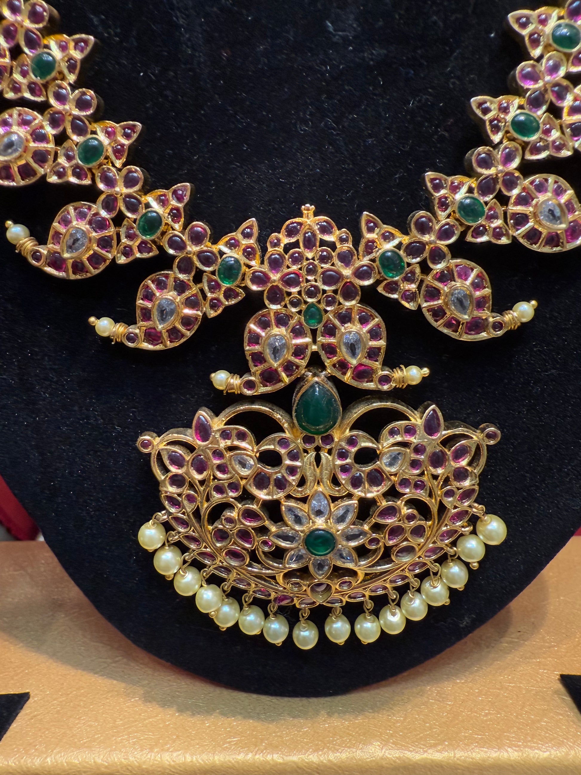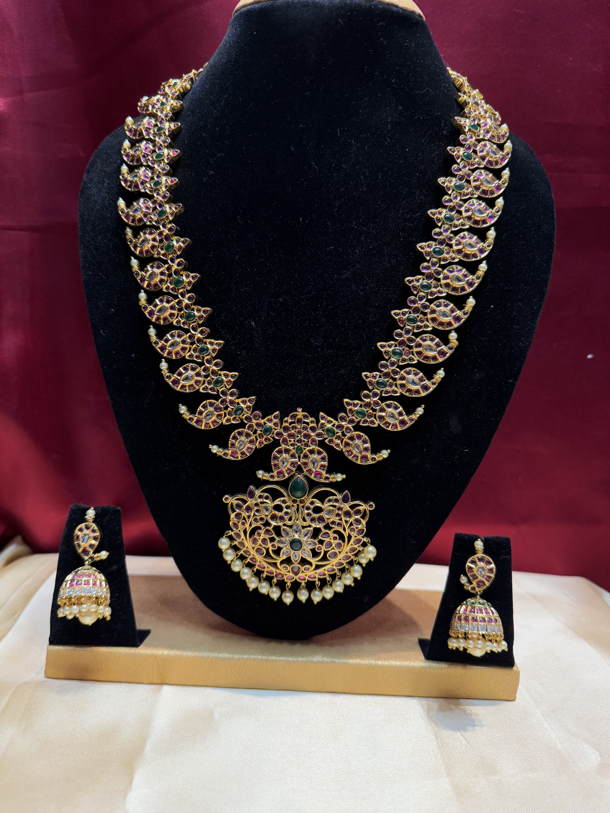 Alluring Long Gold Mango Motif Design Necklace Set With Multicolor Stones
