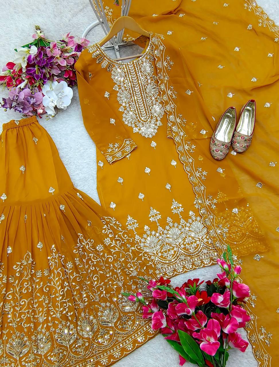 Pretty Mustard Yellow Color Faux Georgette With Heavy Embroidery Work Sharara Suit For Women